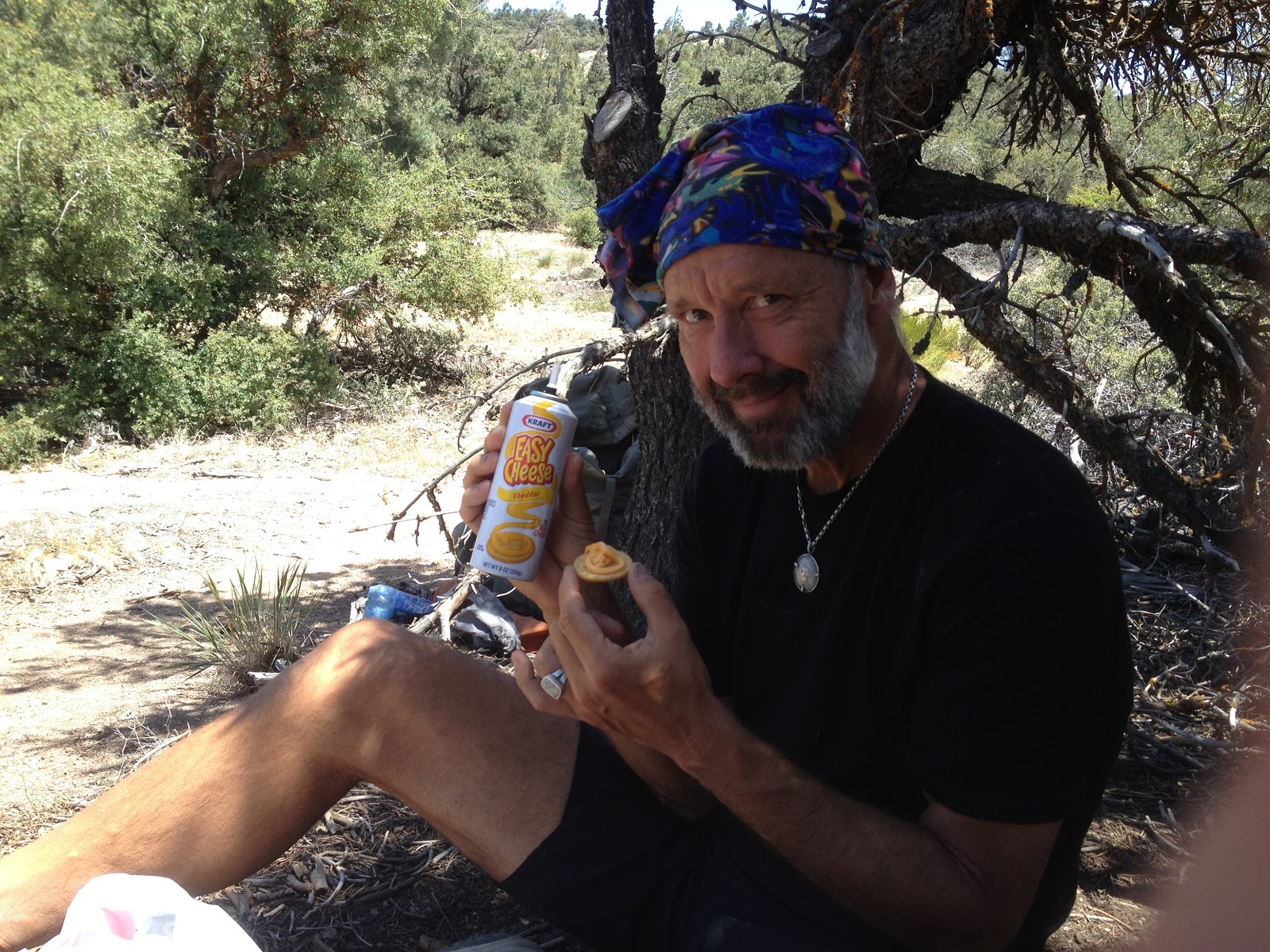 Today, at Robin Bird Spring (barbed wire enclosed to keep cattle out -- up a bit of a hill, and flowing cold! wonderful!] we wash our socks out and hang them first on the barbed wire while we eat and rest a bit from the heat of the day ... later, we hang them on our packs to dry as we hike. [Several thru-hikers were clustered at the spring, including Alphabet Soup, Christian, and others].